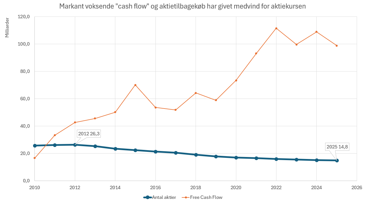 En anden, mere finansteknisk, grund til aktiesuccesen i Tim Cooks tid som CEO er de løbende, meget store aktietilbagekøb. Apple har som vist nedenfor genereret et voksende frit cash flow fra 2010 frem til 2022 fra godt 20 mia. amerikanske dollars til over 110 mia. amerikanske dollars om året.