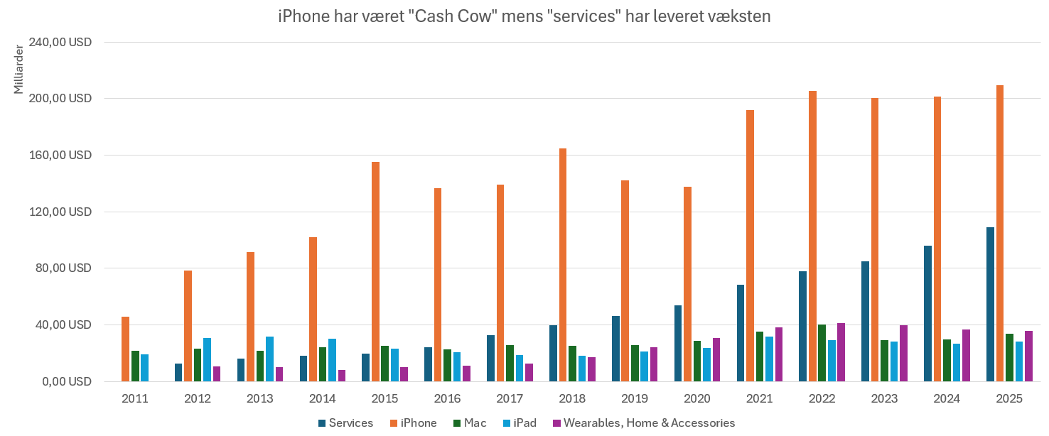 Den helt store vækst har dog været i divisionen ”services”, som de færreste måske forbinder Apple med, relativt til deres kendte produkter som iPhone, iPad eller Mac-computeren.
