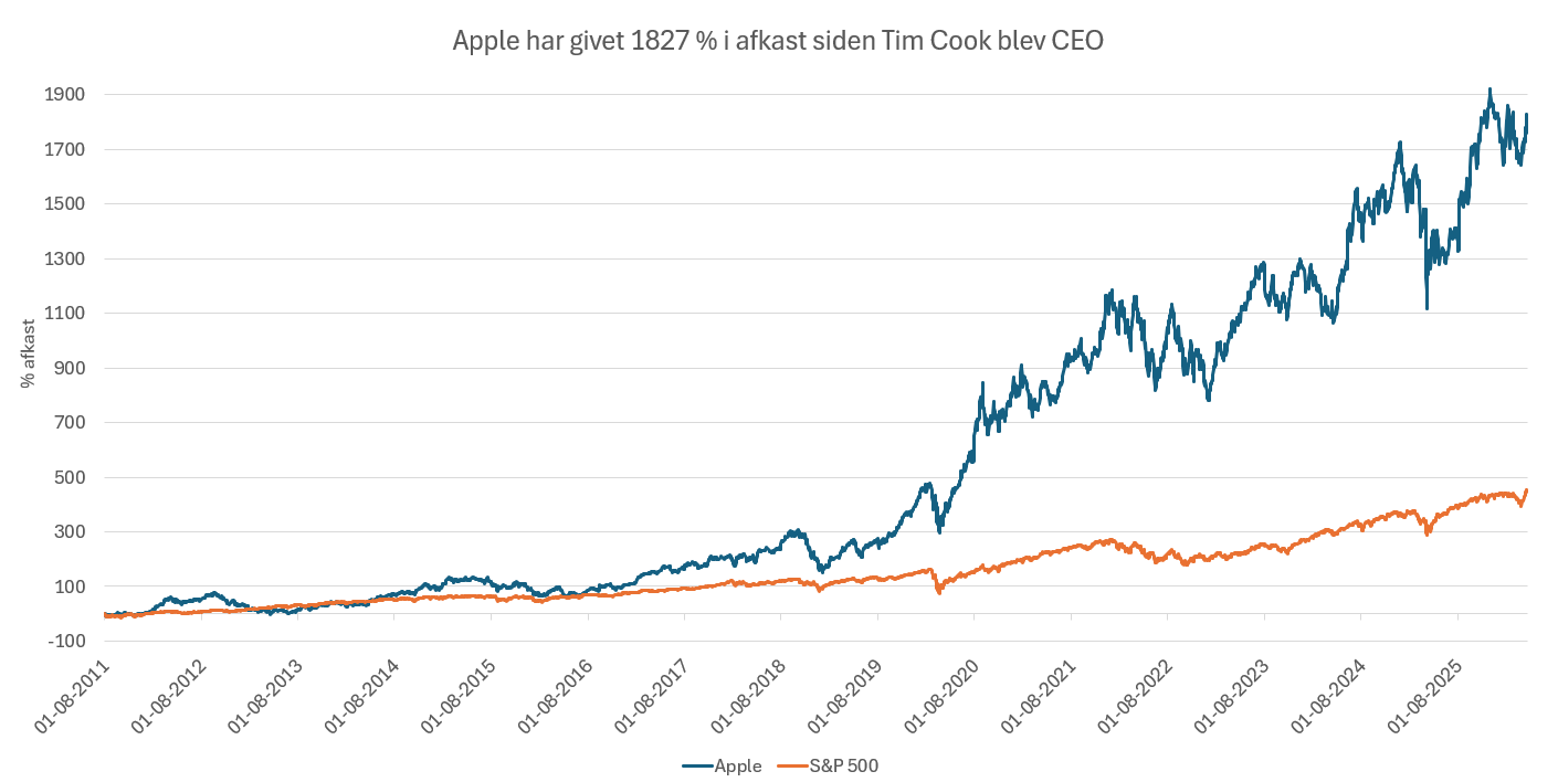 I Tim Cooks tid som CEO kommer man dog ikke uden om, at Apple-aktien har haft en regulær aktiefest, hvor kursen er steget med over 1800 procent siden Cook tog over. Til sammenligning har det brede amerikanske aktiemarked, S&P 500, givet et afkast på godt 450 procent i samme periode.