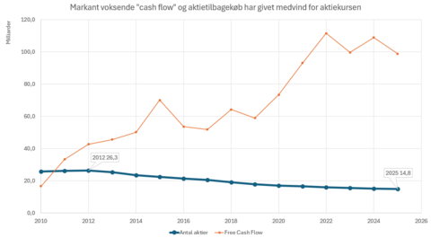 Det frie cash flow er med andre ord den mængde penge, Apple har i overskud, efter at de har lavet nye investeringer i forretningen som f.eks. ny IT-infrastruktur eller produktudvikling.