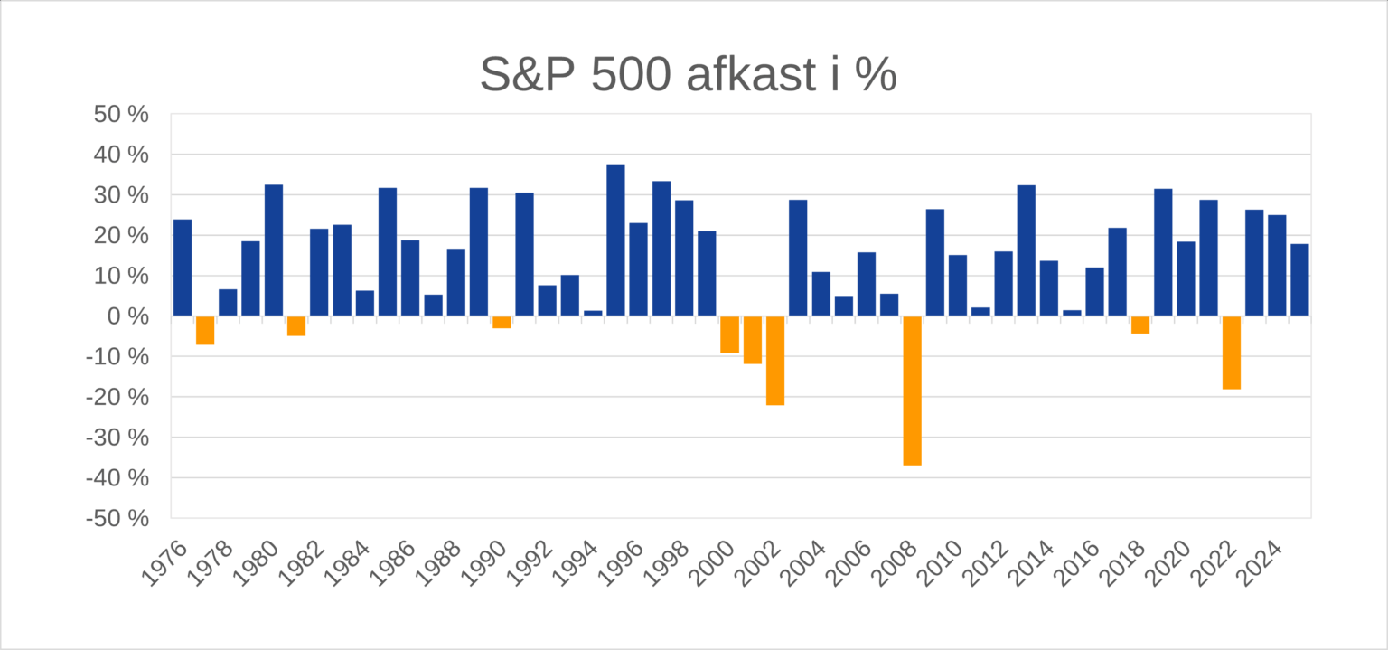Afkast af S&P 500 indekset, 1976-2025 (se tallene sidst i artiklen). Kilde: S&P 500 Total Returns by Year Since 1926.