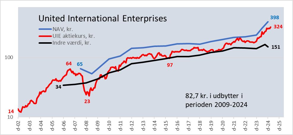 Som jeg har forklaret tidligere, er det vanskeligt at analysere U.I.E. Det bedste man kan gøre er nok, at sammenligne aktiekursen med selskabets såkaldte Net Asset Value (NAV). NAV er øget fra 65 kr. i juni 2008 til 398 kr. i december 2024. Til sammenligning var aktiekursen 304 kr. i december 2024, svarende til en NAV-rabat på 24%. Siden da er kursen steget til 324 kr., men NAV er nok også steget. Det ved vi først, når regnskabet for 1. kvartal lander. Historisk har U.I.E. skabt store værdier for aktionærerne, og selskabet har også udbetalt høje udbytter. Der er således udbetalt i alt 82,7 kr. i udbytter i perioden 2009 til 2024.