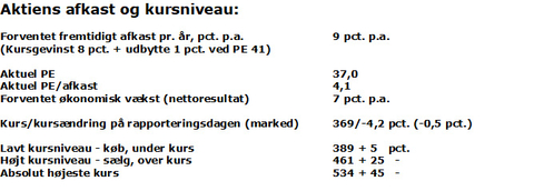 Aktien forventes at give et afkast i det lave niveau på 9 pct. p.a. og aktien er samtidig højt prissat med PE på hele 37 og PE/afkast på godt 4. Da væksten i virksomheden er i det lave niveau, kan den høje PE alene henføres til meget lav risiko og usikkerhed i aktien. Det skyldes virksomhedens brede markedssortiment med fremtidsorienterede, bæredygtige, sunde og miljøvenlige produkter og uden udsigt til forestående patentkløft. Trods de stærke produkter, er virksomheden lidt træg både med hensyn til omsætningsvækst og indtjeningsvækst, der gennemsnitlig i de seneste 10 år har været henholdsvis 4 pct. og rundt 0, dog med stærkere indtjeningsvækst på det seneste. Det indikerer en svag konkurrencesituation, og skyldes markedets langstrakte omstilling til grønne produkter, formentlig alene pga. prisforskelle. Selskabet orienterer om, at Ruslandsaktiviteterne er fortid, og har været mindre omkostningsbelastende i 2025. Der orienteres ikke om salg og produktion i USA.