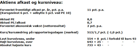 Aktien forventes at give et afkast i det neutrale niveau på 11 pct. p.a., og gør i princippet aktien næsten uinteressant. Aktien er dog tillige lavt prissat med PE på 8,0 og PE/afkast på 0,7, og den lave prissætning skyldes både lave forventninger til økonomiske vækst i virksomheden og til stor risiko i aktien. Væksten i virksomheden er hæmmet af stærkt stigende guld- og sølvpriser, som medfører stigende smykkepriser og dermed lavere efterspørgsel, samt aftagende mulighed for at føre prispolitik. Usikkerheden i aktien knytter sig også til guld- og sølvpriserne, men også i betydelig grad til, at hele virksomhedens produktion foregår i Thailand og for en tredjedels vedkommende afsættes i USA, og dermed er underkastet USA's toldspil. Aktiens øjeblikkelige meget lave kursniveau i forhold til tidligere på godt 500, kommer efter et kursfald fra rundt 1400 ved årsskifter 2024/25 til næsten en tredjedel i dag. Både den øjeblikkelige lave kurs og lave PE har fristet mange medier til at vurdere, at Pandora aktien har potentiale, men tallenes tale og realiteternes verden ser ikke helt sådan ud.