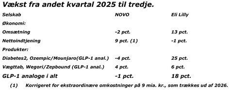 Tallenes tale for NOVO viser fortsat styrke, men i forhold til ærkerivalen og eneste konkurrent, Eli Lilly, står NOVO stille, mens Eli Lilly ikke bare vækster, men har fart på. Det kan tydeliggøres af nedenstående tal, der viser udviklingen i pct. fra andet kvartal 2025 til tredje kvartal, altså kun 3 måneder: