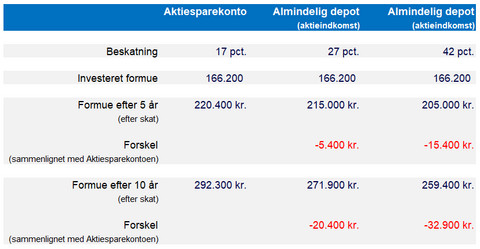 Af Nykredits beregninger fremgår det, at formuen vil være mellem 5.400 kr. og 32.900 kr. større, hvis man investerer via aktiesparekontoen sammenlignet med et almindeligt depot, under de givne forudsætninger.