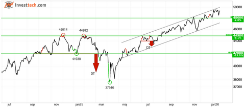 Dow Jones Industrial Average udviser en stærk teknisk udvikling og befinder sig i en stigende trendkanal på mellemlang sigt. Denne opadgående tendens afspejler en markant optimisme i markedet og en støt stigende købsinteresse for amerikanske industriaktier. Da indekset aktuelt befinder sig i et terræn uden modstand i kursdiagrammet, indikeres et fortsat opsving med potentiale for yderligere stigninger. Skulle der opstå reaktioner tilbage, er der et støtteniveau omkring 48 000 points. Samlet set vurderes Dow Jones-indekset som teknisk positivt på mellemlang sigt.
