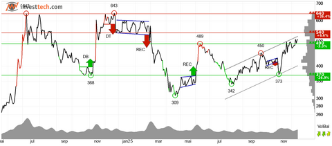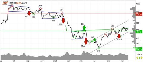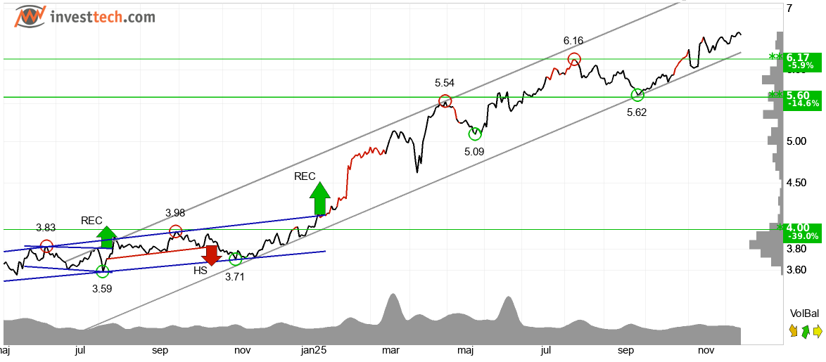 Mandatum ligger i en stigende trendkanal på mellemlang sigt, og der er modstand i kursdiagrammet. Et videre opsving indikeres, og ved reaktioner tilbage har aktien støtte ved cirka 6.17 euro.