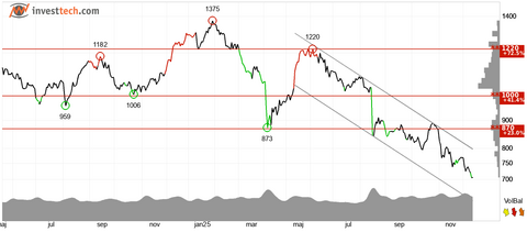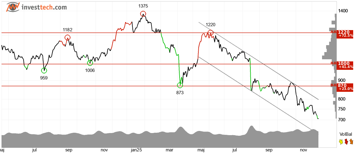 Pandora-aktien ligger i en faldende trendkanal på mellemlang sigt, hvilket betyder, at der indikeres en videre nedgang. Der er ingen etableret støtte i kursdiagrammet, og ved reaktioner opad vil aktien møde modstand ved cirka 870 kroner. Den negative volumenbalance forstærker det negative trend-billede, da volumen er højere på dage med kursfald end på dage med stigning. Dette viser aftagende optimisme hos investorerne og svækker aktien yderligere. Samlet set anses Pandora for at være teknisk negativ på mellemlang sigt, en vurdering som også understøttes af en svag negativ indikation fra insiderhandler efter et nyligt salg i begyndelsen af december.
