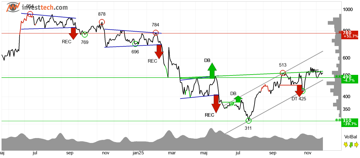 Gubra befinder sig i en stigende trendkanal på mellemlang sigt. Dette indikerer, at investorer konsekvent har accepteret stadig højere kursniveauer for at købe sig ind i aktien, hvilket afspejler en god underliggende udvikling for selskabet. Aktien tester i øjeblikket etablerede niveauer og ligger mellem støtten ved cirka 490 kroner og modstanden ved cirka 540 kroner. Et tydeligt brud på et af disse niveauer vil være retningsgivende for den videre kursudvikling. Den seneste tids handelsmønster viser, at aktien handles mere på dage med kursstigninger end på dage med fald. Køberne har aggressivt presset prisen op for at sikre sig aktien, mens sælgerne ikke har udvist samme villighed til at sælge til lavere kurser. Endelig er den samlede analyse for Gubra også positivt understøttet af insideraktivitet, idet der blev registreret tre insiderkøb i aktien i november.
