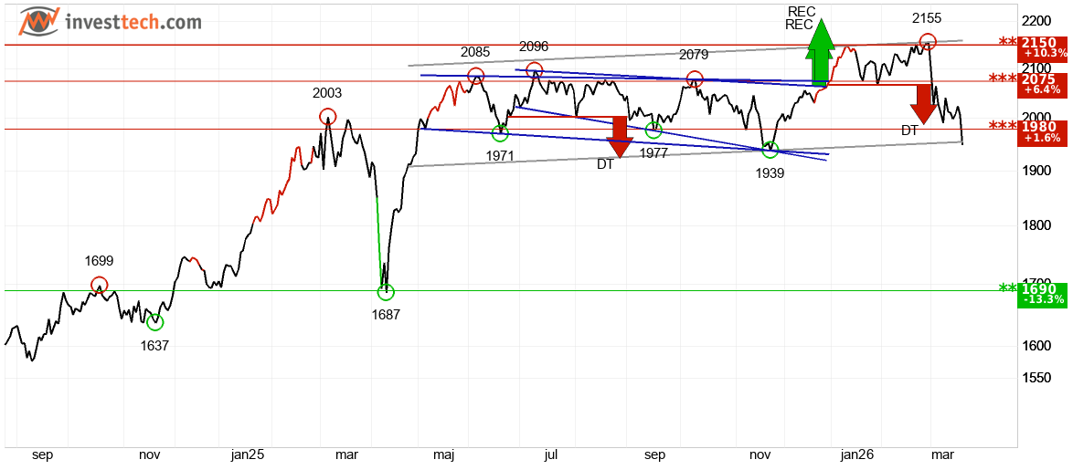 Det tyske CDAX-indeks udviser en svag teknisk udvikling efter to vigtige brud på mellemlang sigt. Indekset faldt først ned gennem støtten ved 1.980 point, hvorefter kursfaldet fortsatte, indtil indekset også brød ud af bunden i den horisontale trendkanal. Disse brud har udløst et salgssignal og indikerer yderligere kursfald for det brede tyske marked. Ved eventuelle reaktioner tilbage vil der nu være modstand omkring 1.980 point. Den negative tendens bekræftes af Investtechs Hausseindeks, som viser en klar overvægt af pessimisme blandt både de kortsigtede og de langsigtede investorer. Samlet set anses CDAX som teknisk negativ på mellemlang sigt.