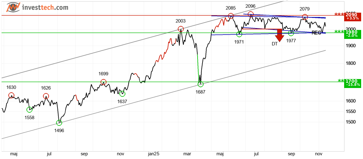 Det tyske CDAX-indekset ligger i en stigende trendkanal på mellemlang sigt. Det viser, at investorer over tid har købt tyske aktier til stadigt højere kurser og indikerer en god udvikling for markedet. Indekset har det seneste halve år bevæget sig i en rektangelformation mellem støtten ved 1977 point og modstanden ved 2072 point. Dette indikerer, at markedet er afventende på kort sigt. Et etableret brud på et af disse niveauer vil signalere den videre retning. CDAX anses samlet set teknisk positiv på mellemlang sigt.