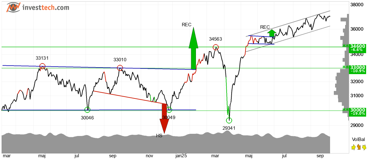 Det finske OMX Helsinki GI-indekset ligger i en stigende trendkanal på mellemlang sigt. Det viser, at investorer over tid har købt finske aktier til stadigt højere kurser, og indikerer en god udvikling for markedet. Der er ingen modstand i kursdiagrammet, og et videre opsving indikeres. Ved reaktioner tilbage har indekset støtte ved cirka 34600 points. På trods af, at indekset teknisk set er klart positivt, afslører Investtechs optimismeindeks (den såkaldte Hausse-indeks) en mere nuanceret stemning i markedet. Blandt de langsigtede investorer er der kun tilnærmet ligevægt mellem optimister og pessimister. Samtidig er billedet endnu mere forsigtigt blandt de kortsigtede investorer, hvor pessimisterne er i overtal.
