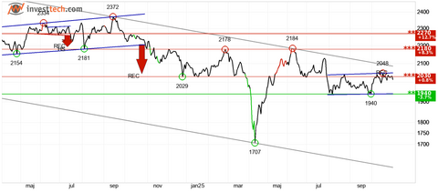 OMX C25 GI ligger i en faldende trendkanal på mellemlang sigt og har også brudt støtten ved 2030 point. Faldende trender indikerer, at markedet er inde i en negativ udvikling, og at købsinteressen blandt investorerne er aftagende. I øjeblikket bevæger indekset sig i en rektangelformation mellem støtten ved 1942 point og modstanden ved 2049 point, og et brud på et af disse niveauer vil være et signal for den videre retning. Indekset anses samlet set for teknisk negativ på mellemlang sigt.