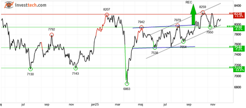 Det franske CAC 40-indeks er placeret i en stigende trendkanal på mellemlang sigt, hvilket signalerer en vedvarende positiv markedsudvikling og voksende købsinteresse blandt investorerne. Indekset genererede et købssignal fra en rektangelformation, da det brød op igennem modstanden ved 7997 point, hvilket i øjeblikket indikerer en potentiel stigning mod 8445 point eller mere. Dog nærmer indekset sig en modstand ved cirka 8220 point, hvilket kan medføre en reaktion ned. Et brud op igennem netop dette niveau vil dog udløse et købssignal. Samlet set vurderes indekset teknisk positivt på mellemlang sigt, en vurdering der understøttes af Investtechs optimismeindeks (Hausse-indekset), som viser en klar overvægt af optimisme blandt de langsigtede investorer på børsen i Paris.