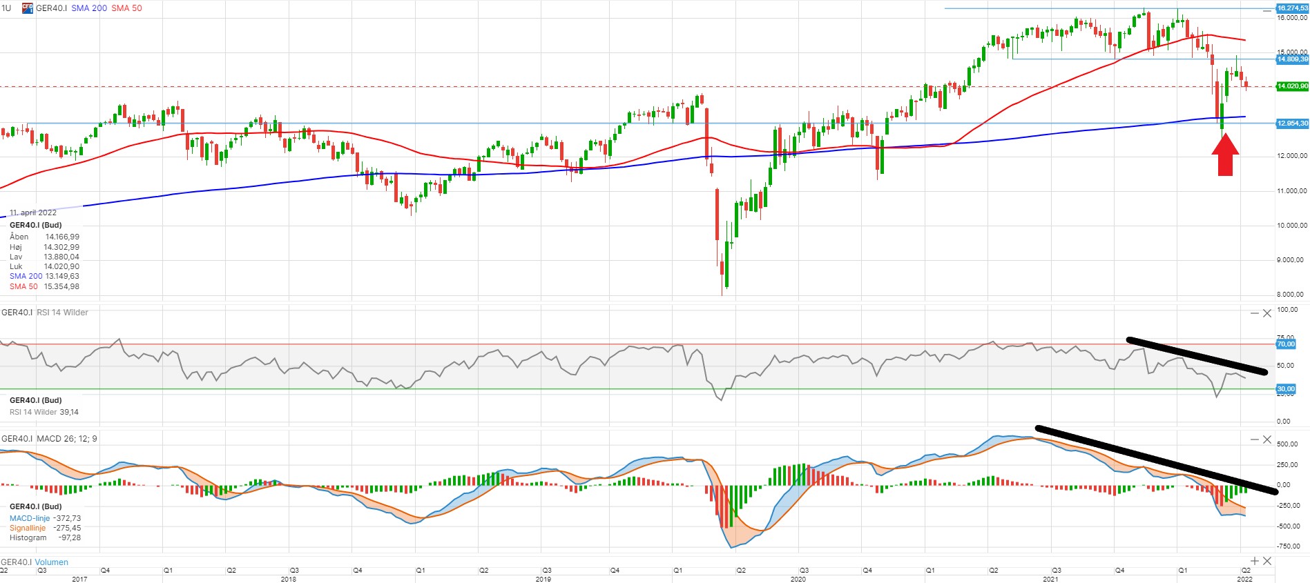 RSI er faldende og under middelværdien 50, hvilket taler for yderligere fald for indekset. MACD er, ligesom RSI, faldende og under middelværdien 0, hvilket indikerer fortsatte fald for indekset. Det ser derfor sort ud for indekset står overfor en afgørende test af støtteniveauet omkring 13.000.