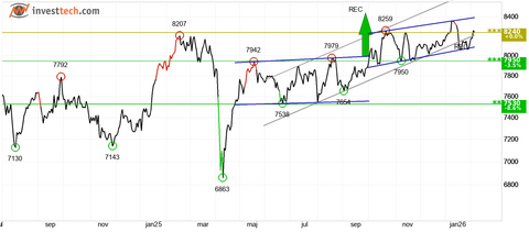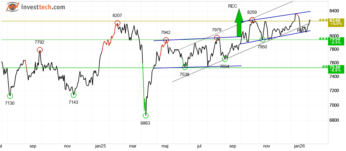 Det franske CAC 40-indeks viser en stærk udvikling i en stigende trendkanal på mellemlang sigt, hvilket vidner om voksende optimisme på det franske marked. På kort sigt bevæger indekset sig i en rektangelformation mellem støtte på 8.090 point og modstand på 8.398 point. Et etableret brud på et af disse niveauer vil udstikke retningen for den kommende tid. Indekset tester i øjeblikket modstanden omkring 8.240 point; et brud herover vil udløse et nyt købssignal, mens en afvisning kan give en mindre reaktion ned. CAC 40 anses samlet set som teknisk positiv på mellemlang sigt.