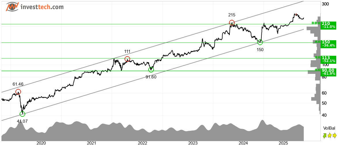 Skjern Bank befinder sig i en langsigtet stigende trendkanal, hvilket indikerer vedvarende optimisme og potentiale for yderligere kursstigninger. Aktien er faldet tilbage siden slutningen af august og nærmer sig nu støtteniveauet ved cirka 210 kroner. Dette kan udløse en opadrettet reaktion. Imidlertid vil et brud ned under 210 kroner blive udløse et salgssignal. Korrelationen mellem volumenstoppe/bunde og kursens tilsvarende toppe/bunde er stærk. Dette bekræfter det positive trendbilledet. Samlet set anses Skjern Bank for at være teknisk positiv på lang sigt.