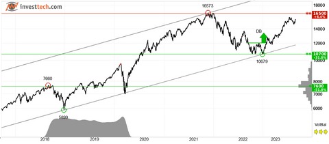 Indekset nærmer sig modstanden ved cirka 16 500 points, noget som kan give en reaktion ned.