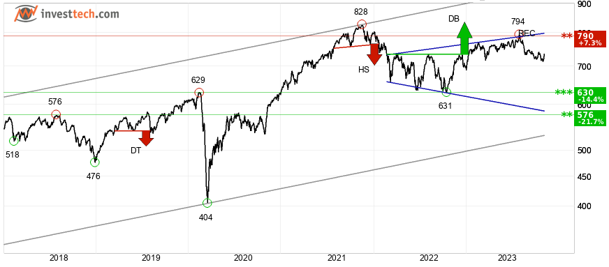 Stigende trends indikerer, at markedet er inde i en positiv udvikling, og at købsinteressen blandt investorerne er stigende. Indekset bevæger sig i en rektangelformation mellem støtte på 585 points og modstand på 799 points, og etableret brud på et af disse niveauer vil være et signal for den videre retning.