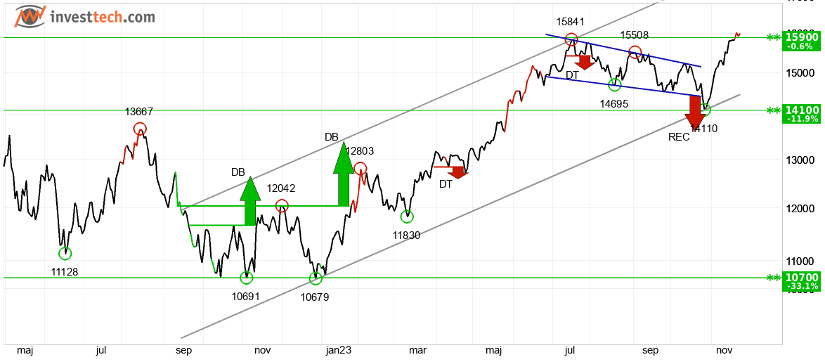 Det amerikanske Nasdaq-100 indeks ligger i en stigende trendkanal på mellemlang sigt. Det viser, at investorer over tid har købt til stadigt højere kurser for at komme ind i indekset og indikerer en god udvikling for markedet. Indekset har marginalt brudt op igennem modstanden ved cirka 15900 points, og etableret brud vil indikere videre opgang. RSI er over 70, noget som indikerer høj optimisme i markedet. Nasdaq-100 indekset anses samlet set teknisk positiv på mellemlang sigt. Vurdering, 1 til 6 måneders sigt: Køb.